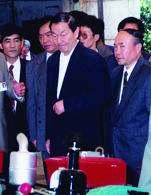 1995年5月7日,中共中央政治局常委、國務(wù)院總理朱镕基視 察 永康四方集團(tuán),參觀四方牌拖拉機(jī) |